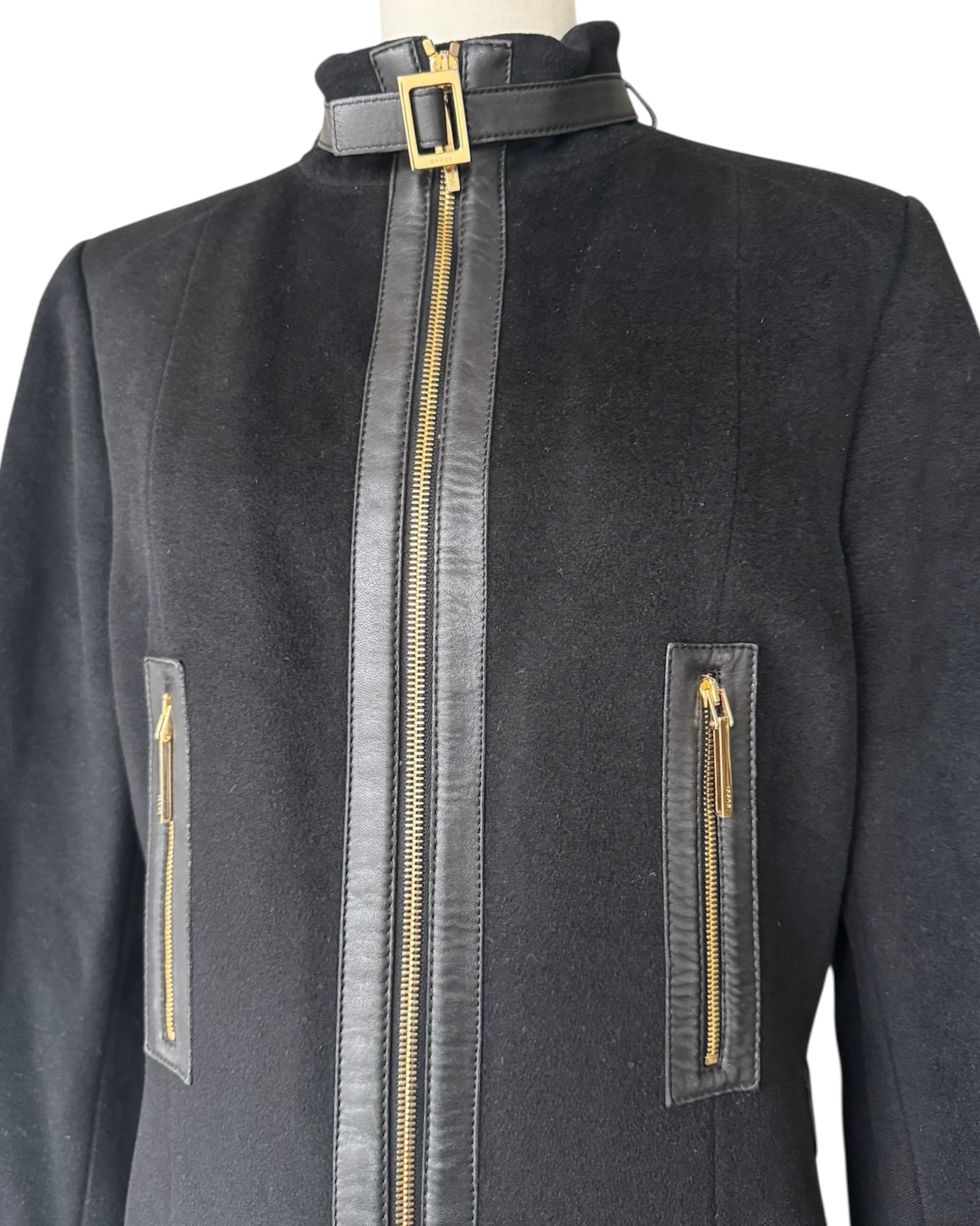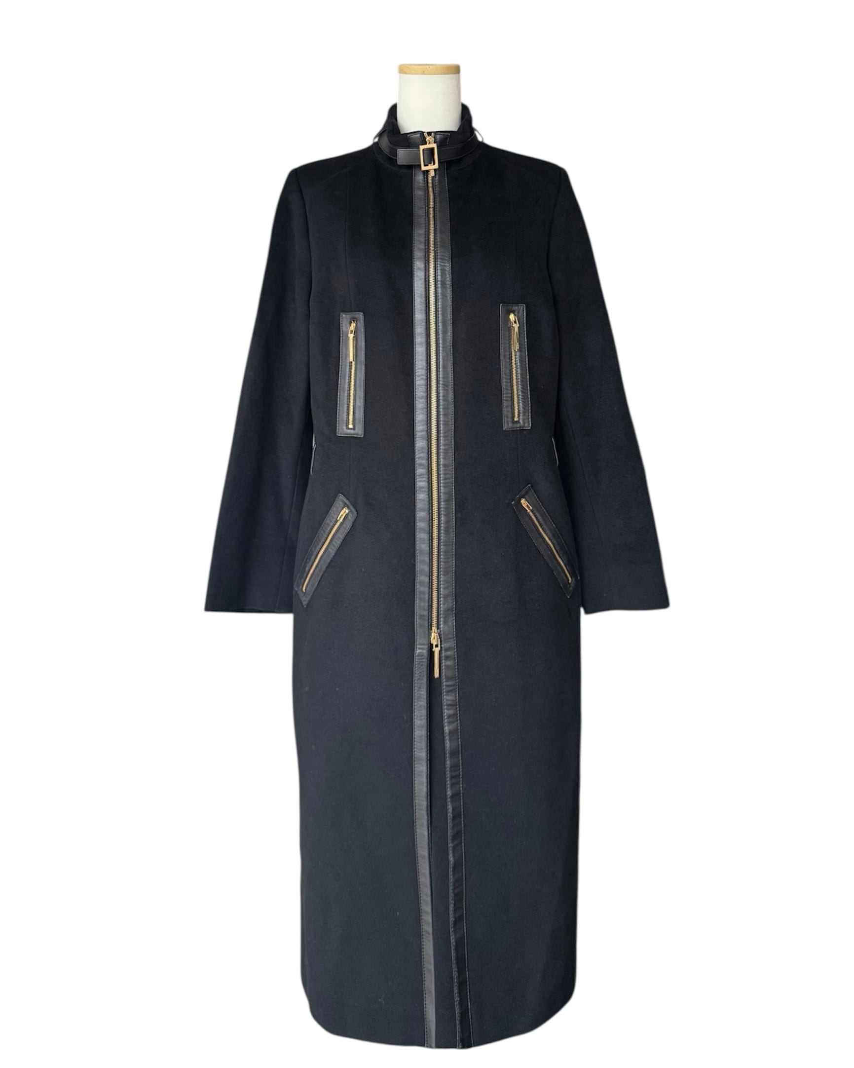 "wool cashmere black gold zip pocket buckle coat"